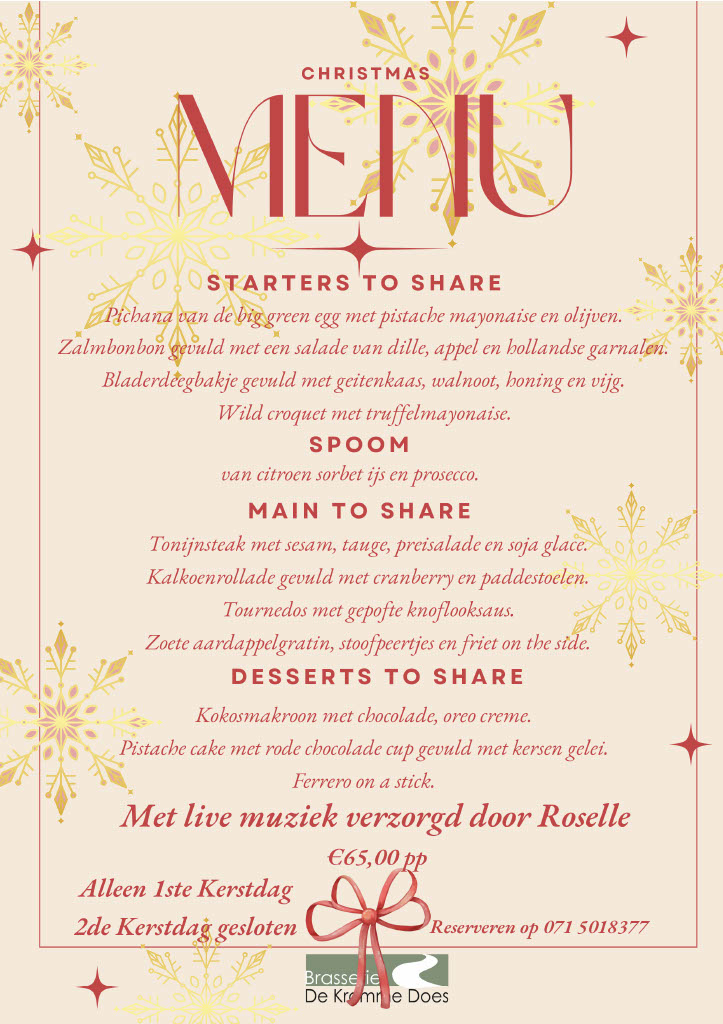 Kerstmenu Wij wensen u een fijne feestdagen!U bent van harte welkom om 1e kerstdag kerst bij ons te vieren,bekijk hieronder ons overheerlijke kerstmenu. Reserveren